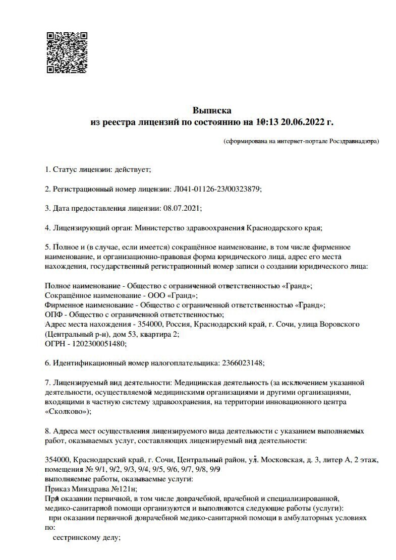 Проводит консультации, лечение кариеса, отбеливание зубов, профессиональную гигиену, лечение дёсен, реставрацию зубов, лечение каналов зубов, лечение под закисью азота, лечение под седацией, рентгенологию и КТ.